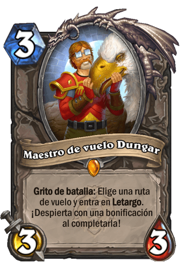 Hasta ahora solo se han revelado 15 de las 135 cartas, y como siempre se hace, se irán revelando mientras que se acerque la fecha de lanzamiento. El primer esbirro Legendario Neutral que se reveló es Maestro de vuelo Dungar, cuya descripción es: “Elige una ruta de vuelo y entra en Letargo. ¡Despierta con una bonificación al completarla!”
