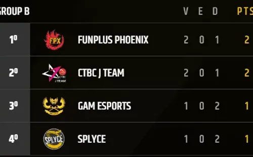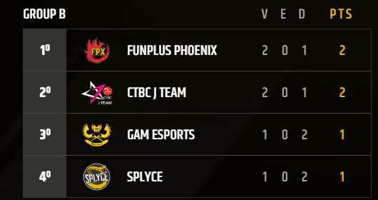 FunPlus Phoenix, campeón de la LPL china era el favorito para quedarse fácilmente con el Grupo B, pero su derrota ante J Team lo deja igualado en puntos con el equipo de la LMS, mientras que Splyce y GAM Esports son los dos que deberán remontar para pasar de ronda.