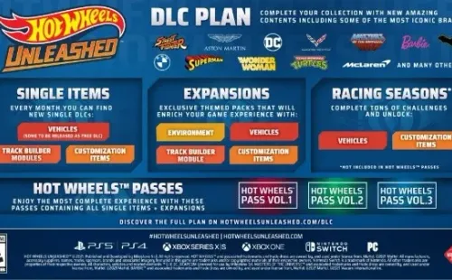 También habrá en el juego Temporadas, que se trata de desafíos con nuevos vehículos y recompensas especiales. Se anunció el Hot Wheels Pass Vol. 1, que incluirá 10 vehículos, tres packs de personalización, tres módulos para el editor de pistas, y la expansión de Batman.