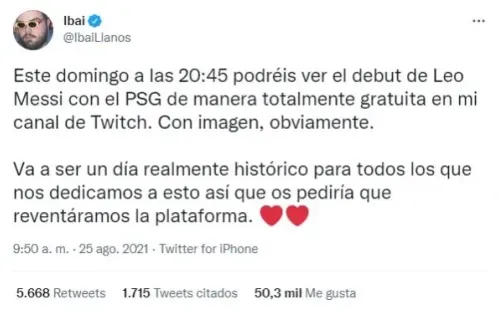 “Este domingo a las 20:45 podréis ver el debut de Leo Messi con el PSG de manera totalmente gratuita en mi canal de Twitch. Con imagen, obviamente. Va a ser un día realmente histórico para todos los que nos dedicamos a esto así que os pediría que reventáramos la plataforma”,comentó Ibai en su Twitter.