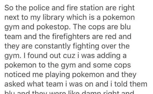 La historia en sí, contada por un usuario de Reddit y respaldada por varios otros, cuenta como la persona en cuestión tiene una libreria. En ella, hay un gimnasio de Pokémon GO establecido y, una vez que estaba poniendo Pokémon en él, se le acercaron unos policias a preguntarle en que equipo estaba. Al contestarles que era parte del equipo azul ellos lo vitorearon y le contaron la peculiar situación.