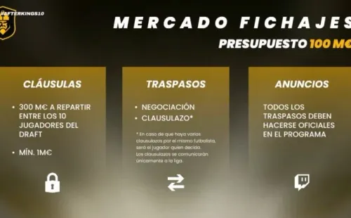 Cada equipo recibirá 100 millones de Euros en moneda virtual, que se podrá usar para el Mercado de Fichajes. No obstante, deberán quedarse con un colchón de algunos millones para utilizar en caso de recibir sanciones o querer comprar beneficios durante el segundo split. Estos 100 millones se reducirán al comprar un jugador, pero se incrementarán si compran a algún jugador de tu equipo.