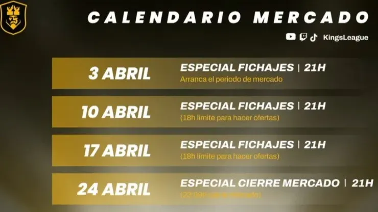 El primer split termina el 26 de marzo, por lo que los Presidentes tendrán tiempo para señalar los valores de las Cláusulas de los jugadores de su equipo del 27 de marzo al 3 de abril, y compartirlo al comité de la Kings League. El 3 de abril se harán públicos estos valores, y a partir de allí comenzará el mercado de fichajes, con cierre el 24 de abril.