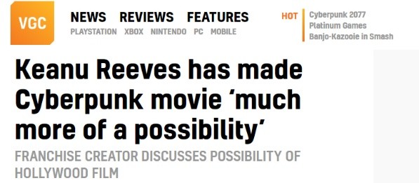 La presencia de Keanu Reeves inmediatamente llevó a todos a pensar en como se llevaría lo que comenzó como un juego de mesa y ahora se ha transformado en un videojuego de última generación, al cine. Fue Mike Pondsmith, creador original del juego, quien salió a hablar recientemente sobre ésta posibilidad con el portal VGC.“Con Keanu Reeves en el medio, es mucho más que una posibilidad”,afirmó, aunque reconoció que no puede hablar sobre “los derechos del juego para películas.”