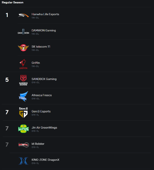La tabla de posiciones del Split de Primavera de la LCK se encuentra de esta manera: