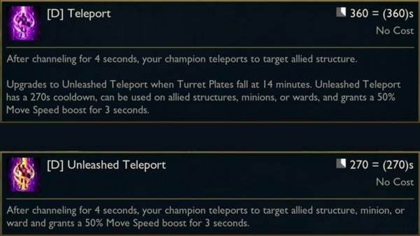 El Teleport base tendrá un cambio importante, y es que por los primeros 14 minutos de partida únicamente te podrás teleportar a las torretas de tu equipo (sólo las estructuras, no las torretas de Heimerdinger), y luego este hechizo evolucionará y contará con menor enfriamiento junto a las ventajas que otorgaba antes la versión base.