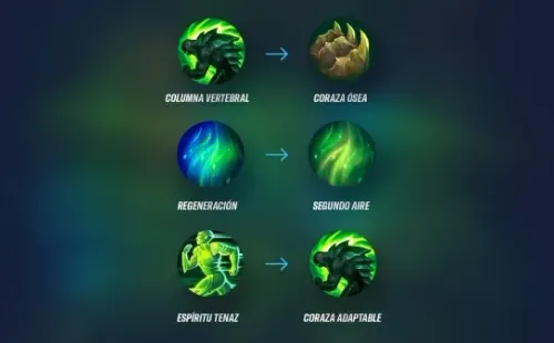 Coraza Ósea hará quedespués de recibir daño de un campeón, las siguientes 3 habilidades o ataques de un campeón contra ti hagan menos daño; Segundo Aire dará mayor regeneración de vida; y Coraza Adaptable otorgará vida máxima adicional y mayor defensa al estar por debajo del 50% de salud.