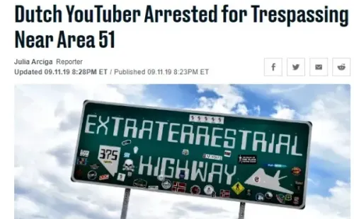 Cuando todo parecía haber quedado en la nada, dos jóvenes fueron arrestados traspasando territorio prohibido para ciudadanos en el Área 51 y, luego de los interrogamientos por parte de la policia revelaron ser dosYouTubers holandeses que llevaban cámaras de video y un dron en su vehículo, con la intención de grabar el interior de la ubicación y revelar sus secretos al mundo.