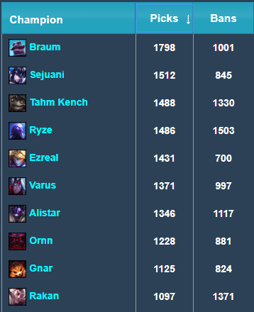 Hay que hacer una salvedad, y es que en este Top 10 podrían haber ingresado Camille, Taliyah y Zoe con un 67%, 58% y 56% de presencias en partidas, pero su cantidad de baneos impidió que sean utilizadas con mayor frecuencia.