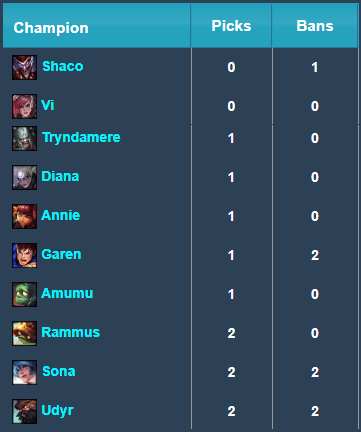 Mientras tanto, en el apartado de campeones menos utilizados Vi y Shaco comparten el hecho de no haber sido utilizados en ninguna partida durante todo el año. Mientras que Annie, Garen, Amumuy Udyrno lograron ganar ni una sola partida.