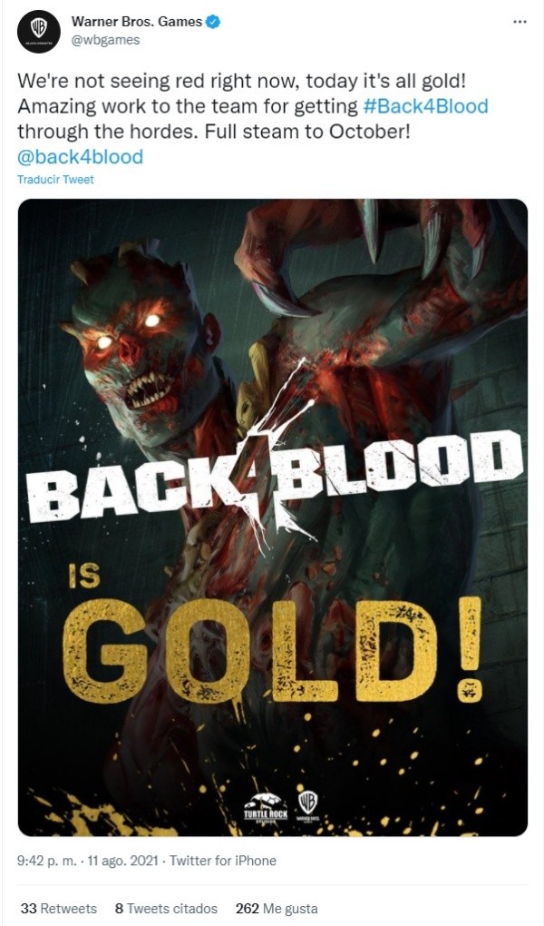 Y es que Back 4 Blood oficialmente se ha vuelto “Gold”, lo cual quiere decir que en Turtle Rock Studios completaron el desarrollo del sucesor de Left 4 Dead, y que el juego está 100% listo para ser lanzado, por lo que su lanzamiento no se retrasará, como ha sucedido con varios otros títulos en este último tiempo.