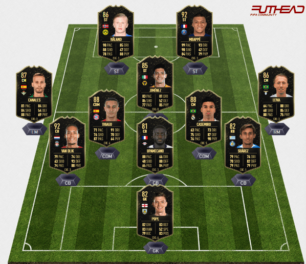 Por otra parte, Raúl Jimenez aparece por segunda vez en el TOTW, como titular, luego de convertirse en el máximo goleador del Wolverhampthon en Premier League. Su nueva carta es de 85 de valoración. Otras cartas interesantes son las de Casemiro (88), Thiago (88), Upamecano (81) y Håland (86). A continuación repasamos todo el equipo: