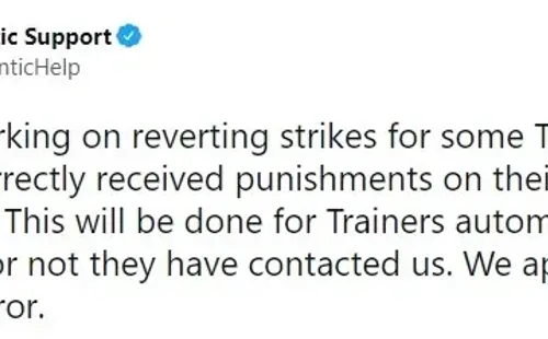 “Estamos trabajando en revertir los baneos para algunos Entrenadores que incorrectamente recibieron castigos en sus cuentas”, escribieron. “Esto se hará automáticamente, nos hayan contactado o no. Nos disculpamos por el error”.