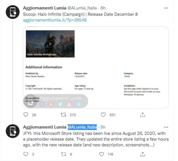 La cuenta de Twitter de ALumia_Italia nos presentó la ficha, y aclaró que lleva activa desde agosto del 2020. Sin embargo, la fecha de lanzamiento y descripción del juego recientemente fueron cambiadas, ya que previamente tenían una fecha irreal. Por lo que según esta nueva actualización de la Microsoft Store, Halo: Infinite se lanzaría el próximo 8 de diciembre.