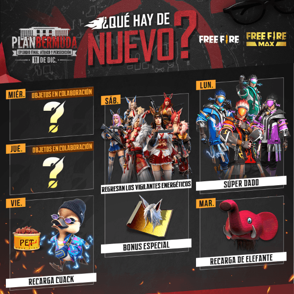 Las novedades continúan el sábado 11, fecha en la que se llevará a cabo el episodio final del Plan Bermuda, y será el día destacado de la colaboración entre Free Fire y La Casa de Papel, tal y como había sido anticipado en la Agenda Semanal de la pasada semana. También regresarán los aspectos de Viajantes Energéticos.