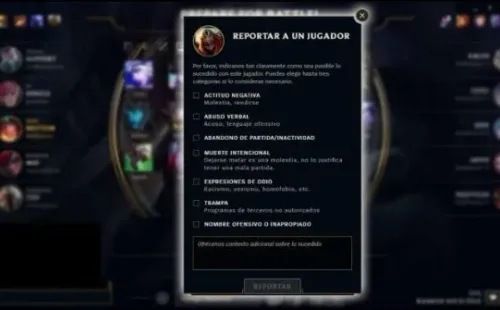 Estamos realizando este experimento para comprender mejor la frecuencia de los distintos tipos de comportamientos negativos en la selección de campeones y qué impacto tienen dentro de la partida (probabilidad de ganar, tasa de reportes dentro de la partida, etc.). La iteración inicial del reporte en la selección de campeones no estará vinculada a nuestros sistemas de penalizaciones.