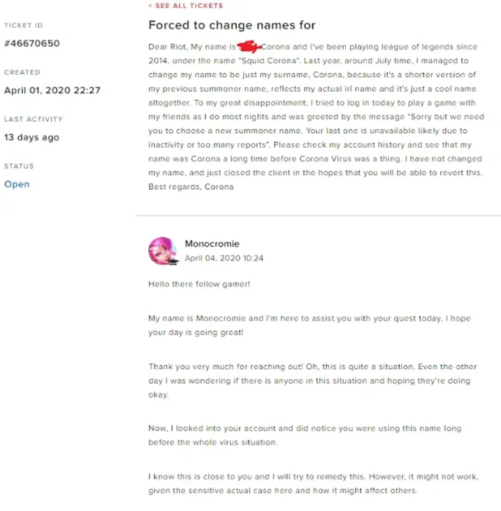 Fue le propio jugador quin hizo público el inconveniente que tuvo con Riot Games. Con pruebas, demostró que la desarrolladora le advirtió que debía cambiar su nombre de usuario (‘Corona’) si pretendía seguir jugando al League of Legends. Debido a la desinformación que se genera por el Coronavirus (eso sin contar todo el pánico que ha provocado) le solicitaron cambiarlo.