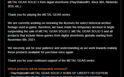 Se trata de Metal Gear Solid 2 y 3, juegos que fueron retirados ya que Konami necesita renovar ciertas licencias, y que a raíz de ello no se podrán conseguir oficialmente de manera digital por cierto tiempo. Lo que Konami necesita volver a licenciar son escenas de ciertos archivos históricos que aparecen en los juegos.