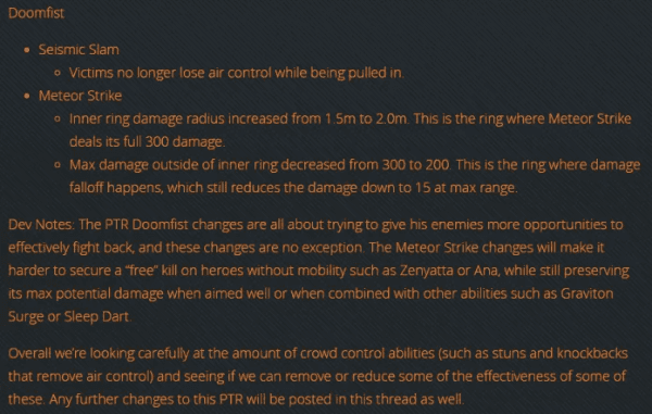 Notas del desarrollador: Los cambios de PTR de Doomfist son pensados con la idea de darle a sus oponentes la oportunidad de contragolpear. Los cambios en Golpe Meteoro están pensados para darmayor dificultad a la hora de asegurar un asesinato contra héroes como Zenyatta o Ana, con poca movilidad. Sin embargo, seguirá siendo redituable para aquellos que puedan apuntar bien la habilidad o al ser combinada con Dardo Tranquilizante u Onda Gravitatoria.