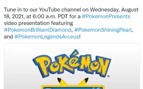 El tweet confirma los tres videojuegos que se estarán mostrando durante el evento. El más esperado seguramente sea Leyendas Pokémon: Arceus, que se estrenará a principios del año que viene, y traerá elementos de mundo abierto a la clásica fórmula de la saga.