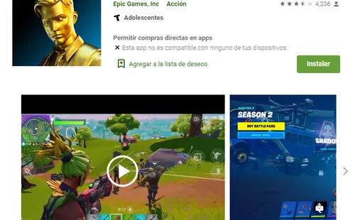 En el siguiente enlace, podrá acceder directo a la opción de descarga de Fortnite en la Play Store de Google, al tienda de aplicaciones para dispositivos móviles más usada en el mundo entero. El único requisito que debemos cumplir es tener disponibles 4,6GB de memoria para alojar la aplicación base. Además, hay que tener un espacio demás puesto que hay descargas de paquetes adicionales que llegan con el juego en cada actualización.