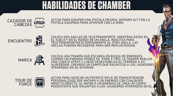 Chamber será un Centinelacontará con dos armas propias, una pistola pesada (Sheriff) con mira, y un Francotirador (definitiva). Además, contará con una trampa que puede dejar en algún lugar del mapa, y que escanea en busca de enemigos. Una vez que detecte a uno, iniciará una cuenta regresiva hasta desestabilizar el terreno a su alrededor, provocando una reducción en sus movimientos.