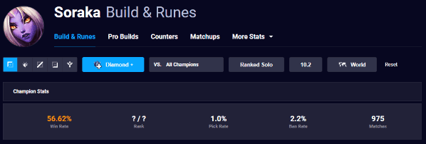 Pero el tema es mucho más profundo, ya que analizando los diferenteselos, podemos ver que Soraka llega hasta el 56% dewinrate.Un número altísimo para cualquier campeón, lo que requerirá medidas inmediatas y muy fuertes por parte de Riot para solventarlo.