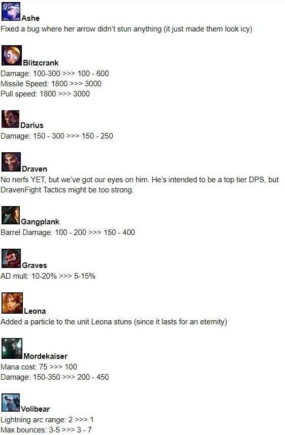 Los principales cambios los reciben Graves y Blitzcrank. El tirador baja su poder de ataque considerablemente, mientras que Blitcrank no sólo sube su velocidad de ataque, sino que la velocidad de sus habilidades incrementa considerablemente. También se menciona que Draven será un tirador de alto nivel.