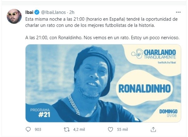 Será una nueva edición del Charlando Tranquilamente, el nombre que Ibai le puso a esta sección de entrevistas que realiza en su canal de Twitch y que tendrá en Ronaldinho al invitado #21, el cual estará este domingo 1 de agosto en el siguiente horario en los respectivos países:
