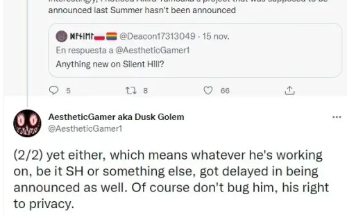 Sin embargo, esto se habría retrasado hasta el 2022, con el anuncio de un nuevo proyecto, tal y como afirmó elinsiderDusk Golem, quien fue consultado al respecto y explicó lo siguiente:“Había escuchado de alguien que no iba a ser presentado en la E3 y que no se presentaría hasta el próximo año. Eso sí, me he dado cuenta de que el proyecto de Akira Yamaoka que se iba a anunciar a mediados de este año, aún no fue anunciado”.
