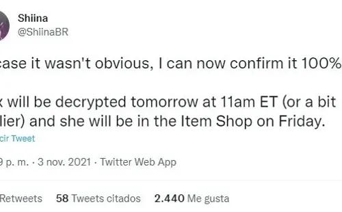 Tal y como informó Shiina BR en Twitter, Jinx será desencriptada y anunciada mañana por la mañana en Fortnite, y estará disponible con la actualización de la tienda de Fortnite del viernes 5 de noviembre por la tarde.