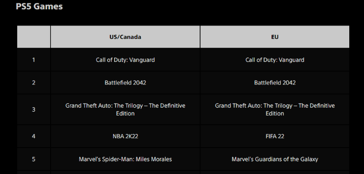 En el caso de PS5, también es Vanguard quien lidera ambas regiones, y en segundo y tercer lugar están Battlefield 2042 y GTA: The Trilogy respectivamente. El cuarto lugar lo ocupan NBA 2K22 y FIFA 22, uno en cada región, mientras que el quinto se lo reparten entre dos juegos de Marvel.
