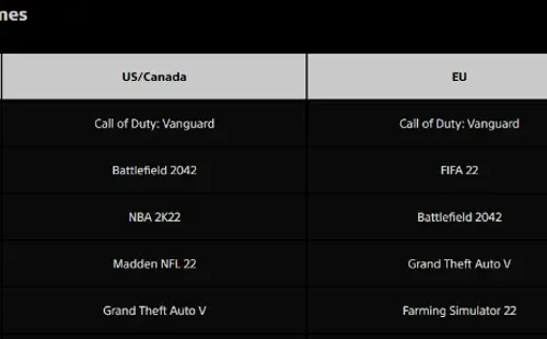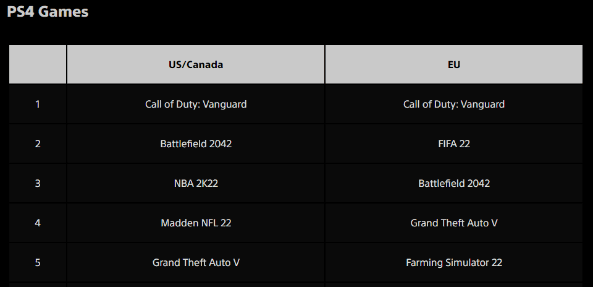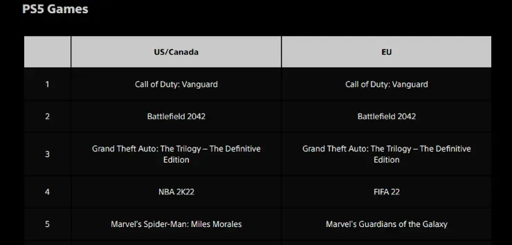 Aquí la lista la lidera Call of Duty: Vanguard tanto en Norteamérica como en Europa. En segundo lugar, se encuentran FIFA 22 y Battlefield 2042 respectivamente. El único otro juego que comparte el top 5 entre las dos regiones es Grand Theft Auto V.