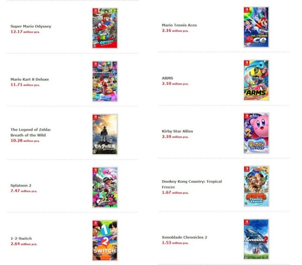 Super Mario Odyssey lidera con 12,17 millones de unidades, lo sigueMario Kart 8 Deluxecon 11,71 yZelda: Breath of the Wildtermina el podio con con 10,28 millones.