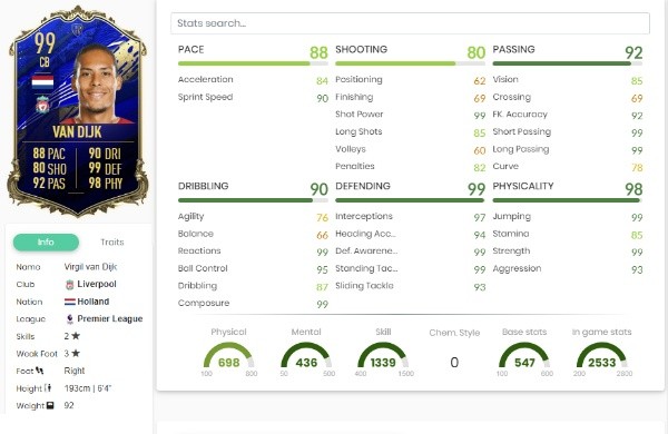 Alisson lo sigue en valoración con 97, MatthijsDe Ligt tiene 96 y luego los laterales, Trent Alexander-Arnold con 95 y Andrew Robertson con 94. A continuación compartimos las estadísticas detalladas de cada uno de ellos:
