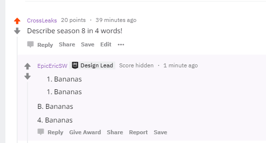 Aquí arriba hay una imagen del mapa de Fortnite, cuando se llenó de nieve. Como se puede ver, el sector ocupado por el Cuadrante B4 no se cubrió de nieve, como si lo hizo el resto de la isla. Lo cual puede indicar que algo extraño sucede allí. Además, como se ve debajo, el desarrollador de Fortnite, Eric Williamson, respondió utilizando las propias coordenadas cuando se le pidió que describiera la Temporada 8 en pocas palabras.