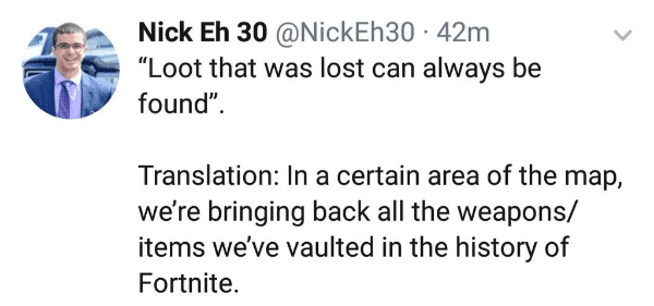 La teoría no parece tan probable ya que también dice que las armas pequeñas y las SMG’s serían enviadas a la bóveda. Sin embargo, si predijo correctamente que los aviones serían enviados a la bóveda (como confirmó Epic Games en una serie de preguntas y respuestas en Reddit).