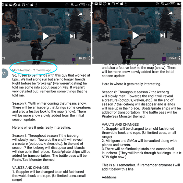 Otra de las fuertes teorías parte de un comentario que lleva un par de meses en YouTube. Este comentario predecía que la Temporada 8 de Fortnite sería basada en una temática de Piratas/Monstruos Marinos. Además mencionó que objetos serían modificados, como el Lanzaventosas y se transformaría en un gancho con soga; también que el iceberg se derretiría a medida que la Temporada 8 corriera y revelaría una criatura (pulpo, kraken, etc.).