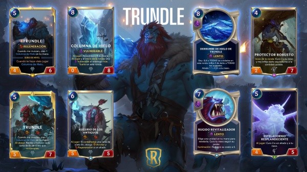 Hasta ahora, Taric y Lulu habían sido los dos campeones revelados, y llegó el momento de conocer al tercero: Trundle, el Rey de los Trolls. Trundle será la carta principal para mazos de gran poder, pero gran costo también, ya que Trundle cuesta 5 puntos de energía, y su carta insignia “Columna de Hierro”, cuesta 8.