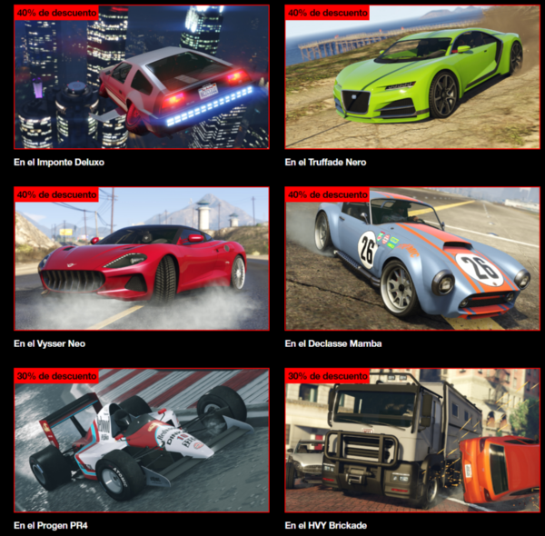 Pero no es lo único con lo que se encontrarán los jugadores; hasta el 3 de junio podrán recompensas triples al competir en carreras del Issi clásico y reclamarla camiseta Weeny de forma gratuita. También habrá descuento del 50% en el precio del Issi clásico y del Issi Sport. Varios otros vehículos se podrán obtener con descuentos también, como se muestra a continuación.