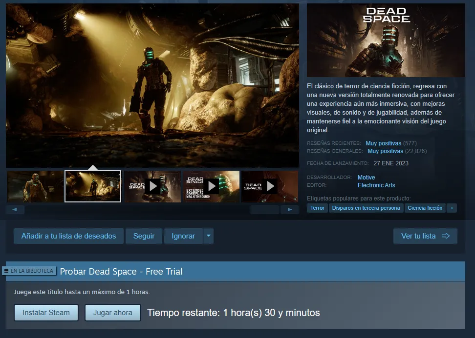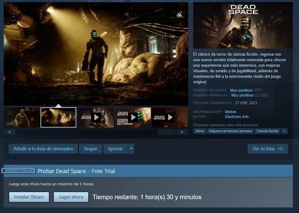 Desde ahora, Steam empezó a ofrecer una versión de prueba para ciertos juegos, algo que todavía no se había hecho en la plataforma. Para probarlo, es muy simple: solo debes buscar Dead Space, o ingresar directamente desde este enlace, y seleccionar “Jugar ahora” donde nos encontramos con la prueba gratuita.