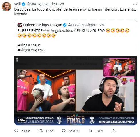 La jornada 8 del segundo split de la Kings League tuvo un duro cruce entre el Kun Agüero y el streamer, Ángelo Valdés, mejor conocido como Will. El presidente de Kunisports perdió los papeles en pleno directo.