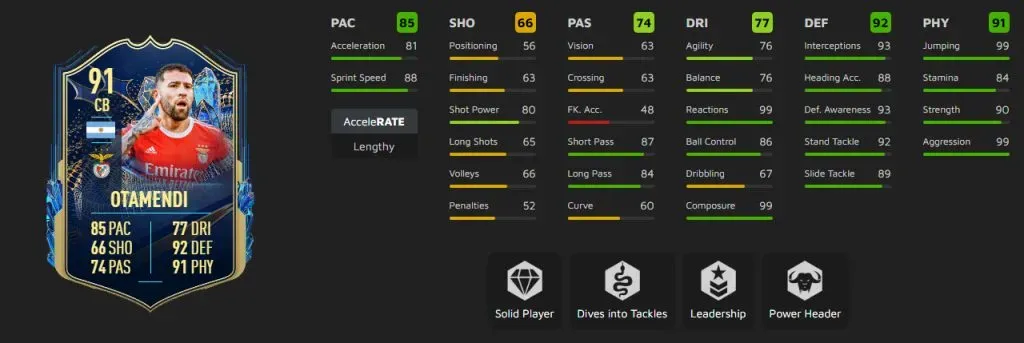 Entre sus atributos más destacados se encuentran sus 92 puntos en defensa, 91 en físico y 85 en ritmo, tres atributos más que importantes para los defensas centrales del juego. Además, cuenta con los atributos de Liderazgo, Solidez, Cabezazo y Entradas deslizables.