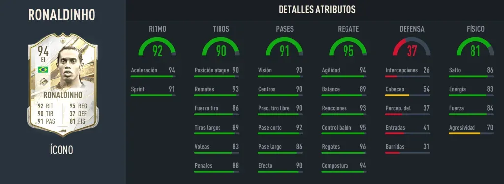 Primero, repasamos la carta en sí: no quedan dudas de que es una auténtica bestialidad, con 5/4 de estrellas en filigranas y pierna débil. Sus stats son altísimas sobre todo en regate y ritmo, llegando a 94 en agilidad y 95 en control de balón. Además como todo jugador histórico, cuenta con animaciones personalizadas.