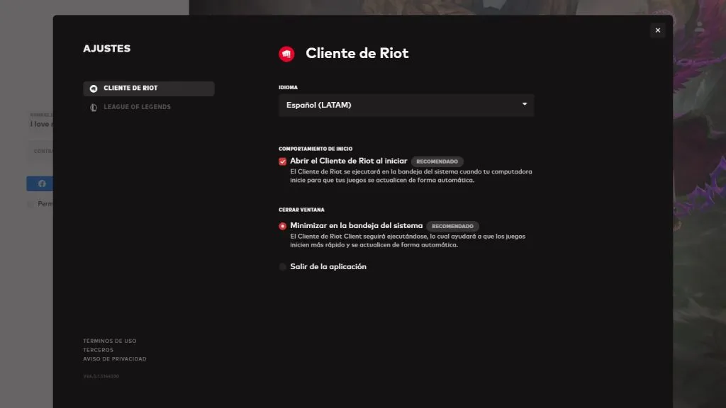 - Selecciona y desactiva la casilla “Abrir el cliente de Riot al iniciar”