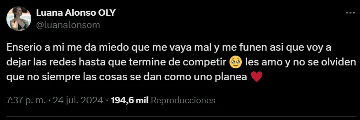 Sin embargo, como suele suceder, la fama en ese mundillo virtual trae también sus consecuencias poco agradables, y es así como en las últimas horas, Luana Alonso anunció que iba a dejar de usar su cuenta de X por miedo a ser “funada” si los resultados en París no son los esperados.