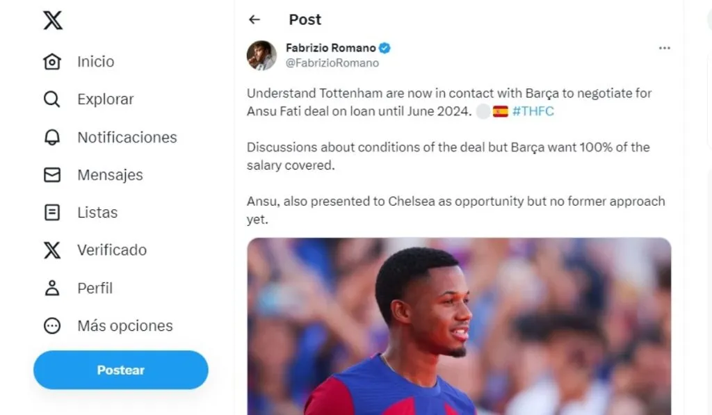 “Entiendo que el Tottenham ya está en contacto con el Barça para negociar la cesión de Ansu Fati hasta junio de 2024…Se debaten las condiciones del acuerdo pero el Barça quiere cubrir el 100% del salario. Ansu, también se presentó ante el Chelsea como oportunidad pero sin acercamiento previo aún”, palabras de Fabrizio Romano para confirmar la información de medios como AS, Mundo Deportivo o COPE.