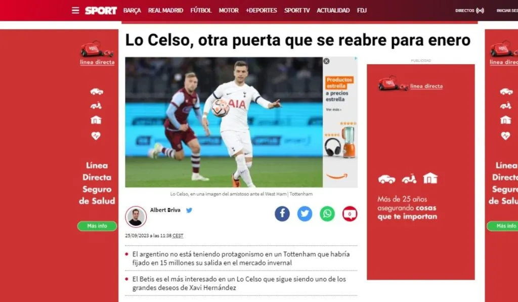 Vayamos primero a Londres, donde el regular Tottenham no cuenta con los servicios de un Gio Lo Celso que apena ha gozado de 63 minutos bajo el mando de Ange Postecoglou. 15 millones de euros piden en el mercado de invierno por un futbolista lleno de calidad y que ya ha brillado en LaLiga. Sport habla de un interés del Barcelona que se mantiene, así como de un Betis loco por recuperarle a corto plazo. Villarreal, otro que suena.