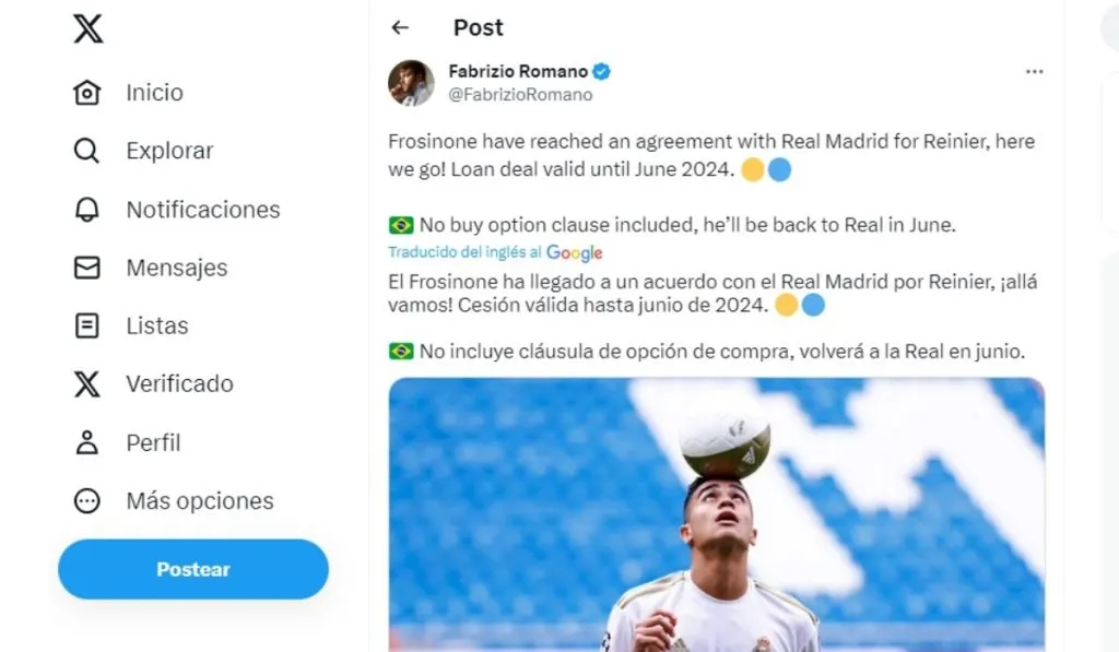 “Frosinone ha llegado a un acuerdo con Real Madrid por Reinier, ¡Here we go! Cesión válida hasta junio de 2024…No incluye cláusula de opción de compra, volverá a Real Madrid en junio”, palabras del periodista especializado en el merado y por medio de su cuenta de Twitter para desgranar la operación. Salvo giro de 180 grados, será el último movimiento de la entidad merengue. Ante la ausencia de nuevos delanteros, ganan enteros los juveniles Gonzalo y Álvaro Rodríguez para las próximas convocatorias de Carlo Ancelotti.