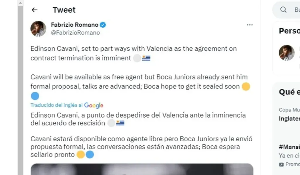 “Edinson Cavani, a punto de despedirse del Valencia ante la inminencia del acuerdo de rescisión. Cavani estará disponible como agente libre pero Boca Juniors ya le envió propuesta formal, las conversaciones están avanzadas; Boca espera sellarlo pronto”, palabras del gurú del mercado de fichajes a la espera de que por Mestalla se destrabe la situación.